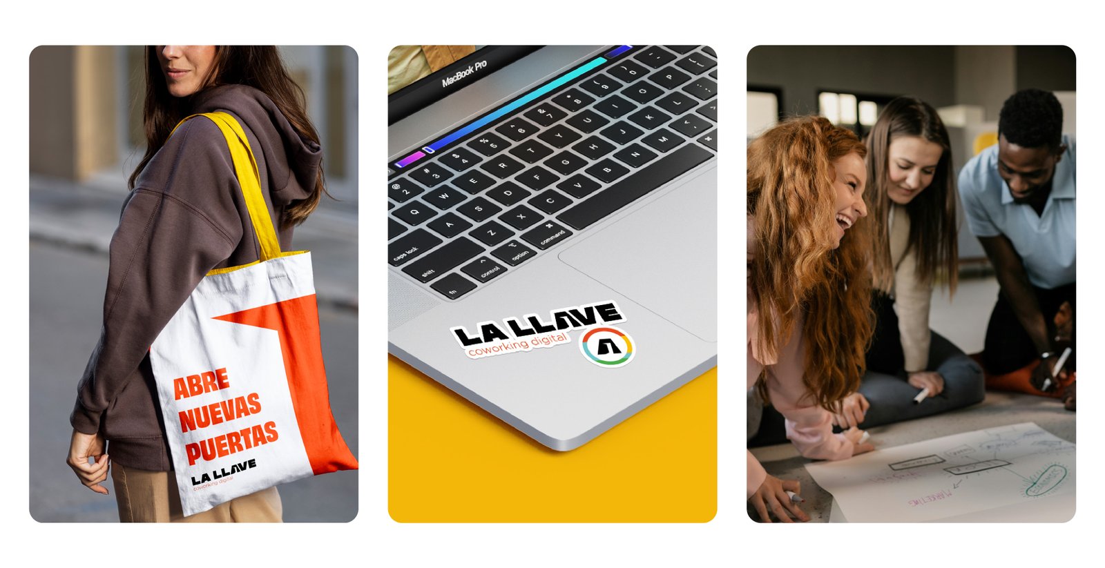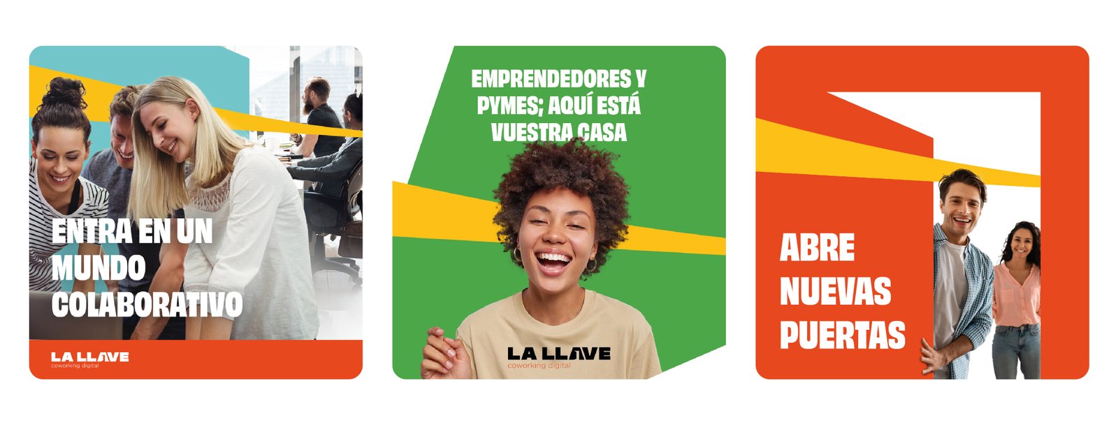 The Solution: As a solution to this challenge, a graphic system was created based on a logo that responds to the needs of the brand. The coworking space, called La Llave, is represented by a logo containing an icon that symbolizes an open door, encapsulating the idea that this space offers the key to open the doors to new opportunities. This clear and bold design allows for the creation of a universe of abstract shapes and vibrant colors, continually inviting viewers to explore the space.