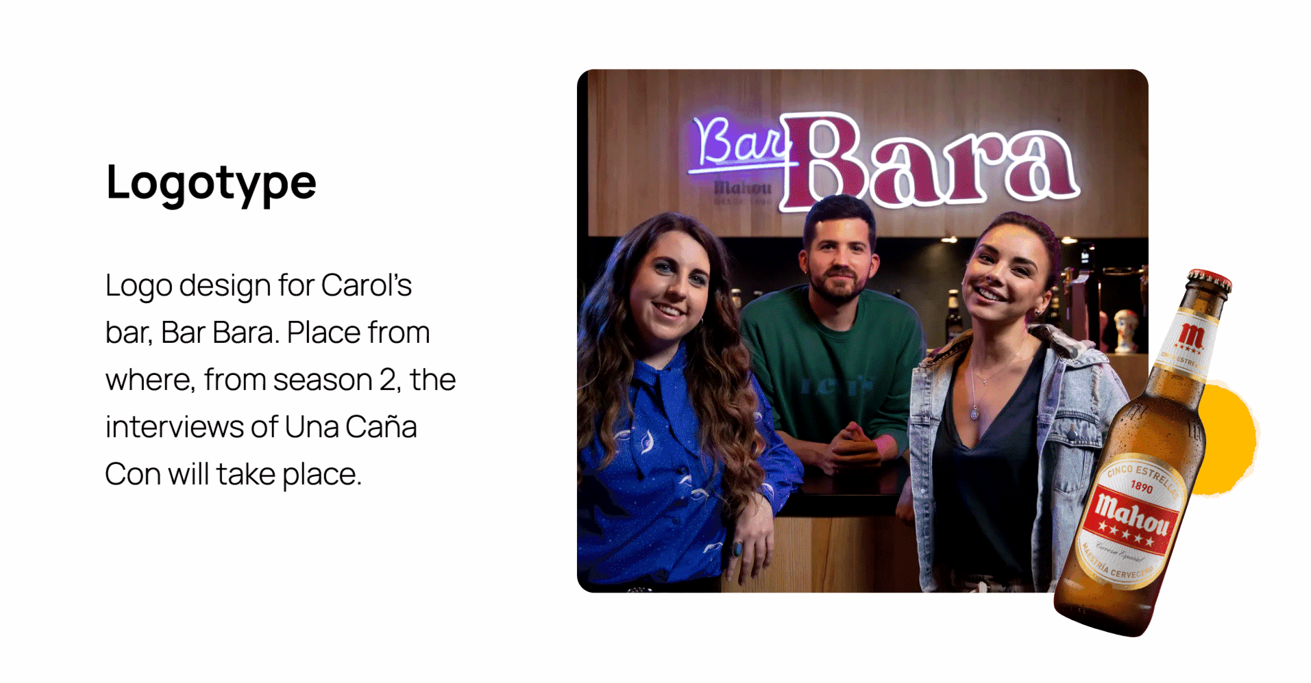 The Solution: For Carol's Bar, known as Bar Bara, I developed a logo that is still used as an integral part of the set. It is a logo mainly composed of neon light, keeping the essence of a conventional bar, but thanks to its graphic design and typography, it manages to connect with Generation Z.